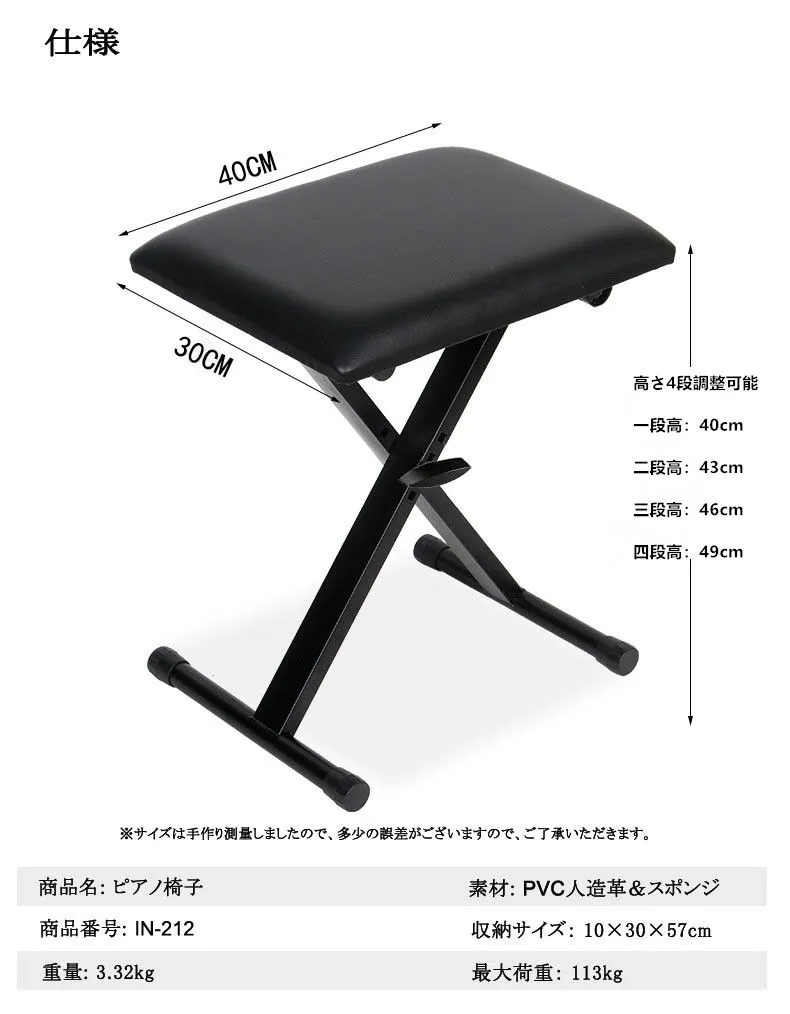 ピアノ椅子 チェア イス 折畳 ベンチ 4段調整 キーボード椅子 高調整 楽器