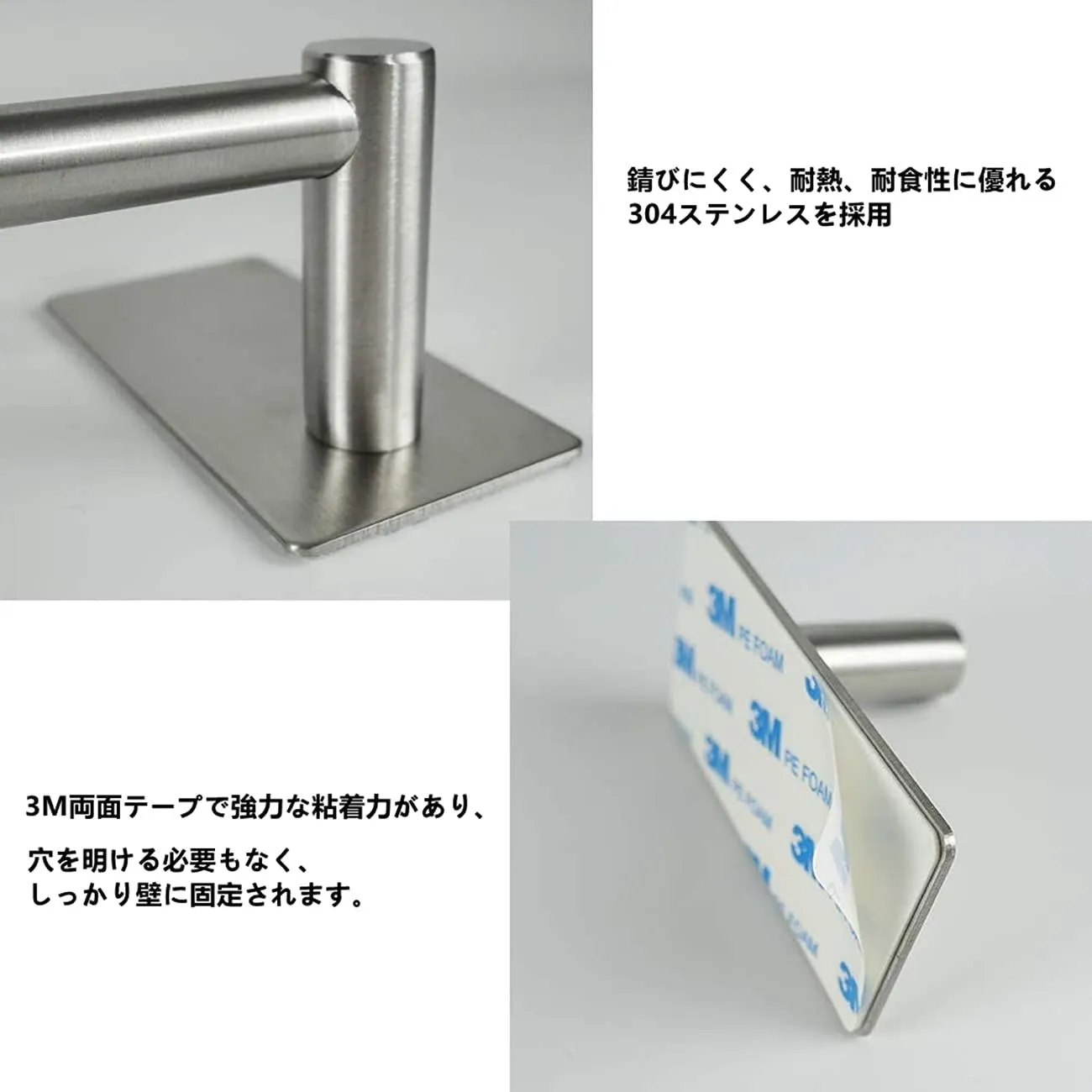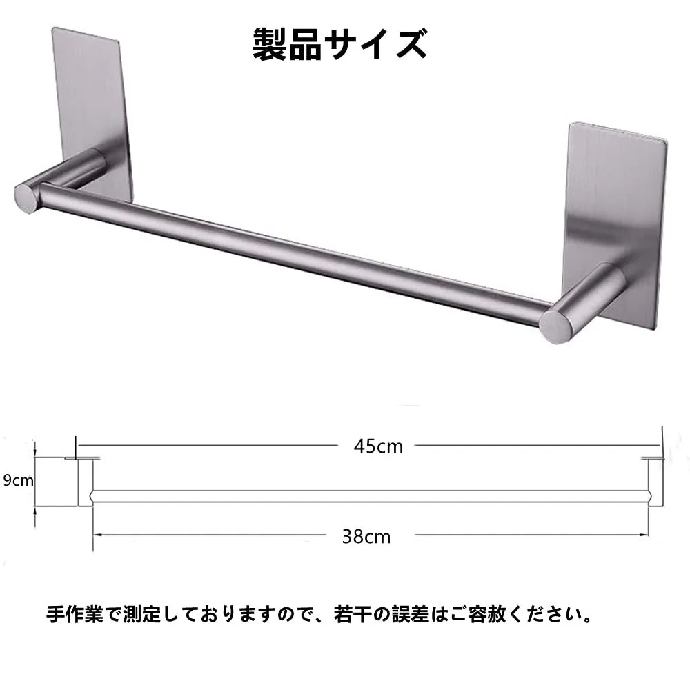 タオル掛け 粘着 タオルハンガー ステンレス タオルかけ 45cm 洗面所 キッチン 風呂場 浴室用タオルバー 壁 穴あけない ふきんかけ フック タオル収納