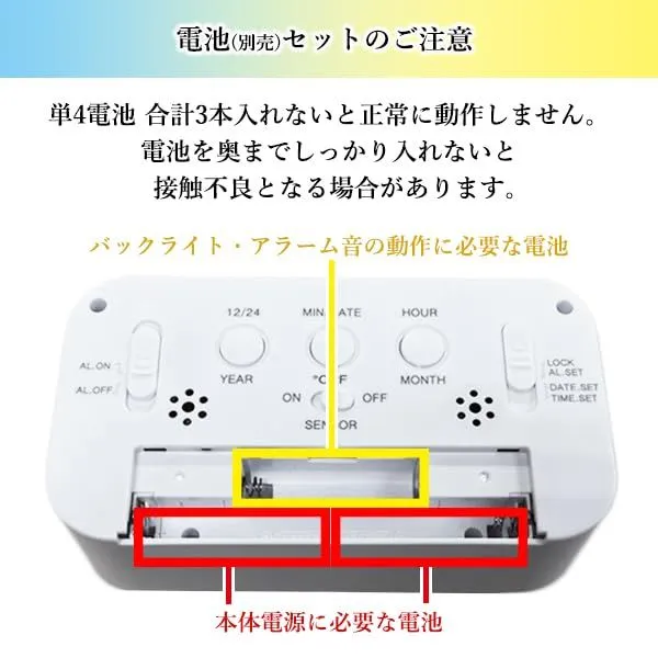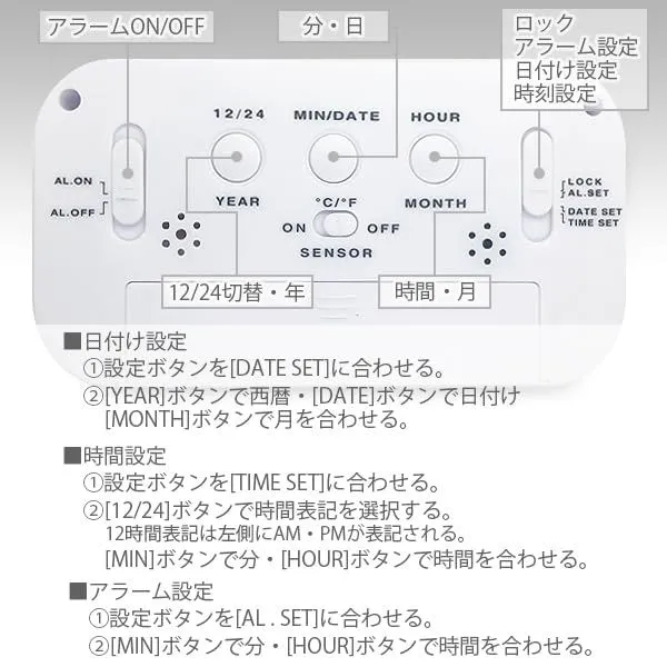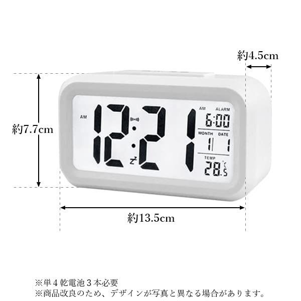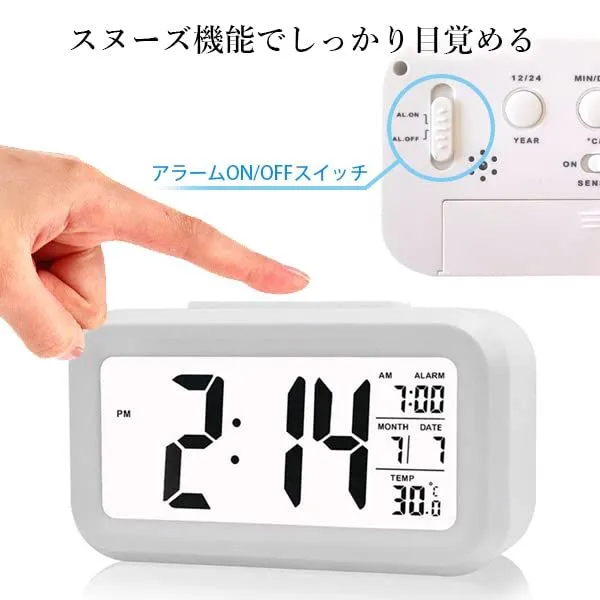 ・大きな字がとても見やすい。時刻以外に日付や温度の表示もあります。 ・暗くなると、バックライトが優しく自動点灯。 ・スヌーズ機能でしっかり目覚める。