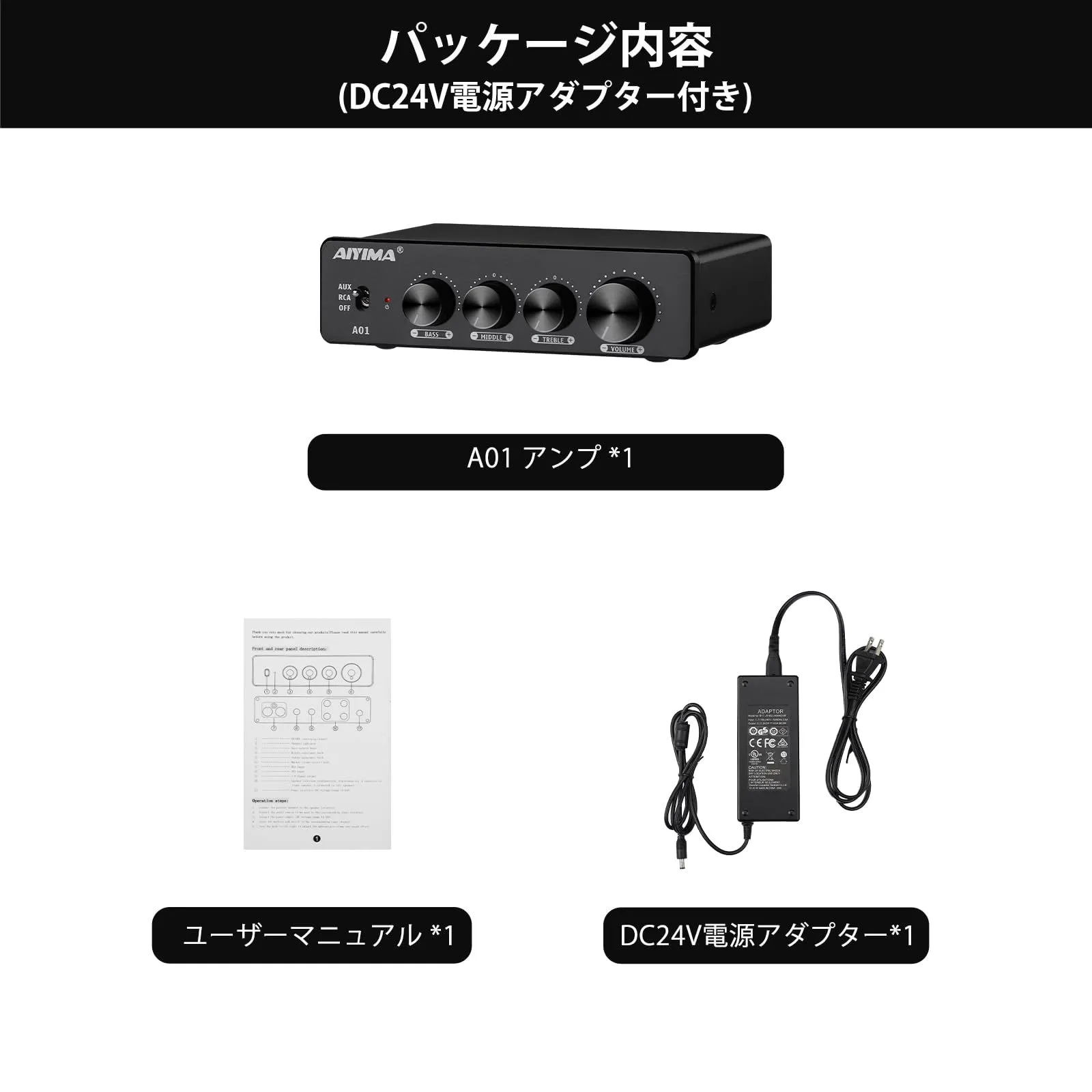5. 製品には 24v 4A電源アダプターが付属しています。 AIYIMA の製品はすべて18ヶ月の付きです。 期間中、不具合が生じた場合は、AIYIMA AUDIO サービスセンターにご連絡ください。