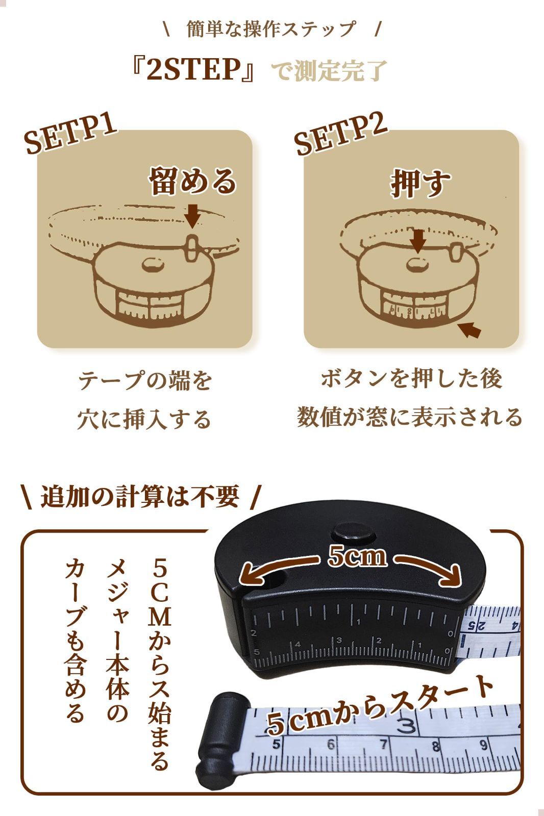 【簡単な操作ステップ】STEP1: テープを測定物に巻き、テープの端を穴に挿入します。STEP2: ボタンを押して、テープを収縮させて、数値はのぞき窓に表示されます。