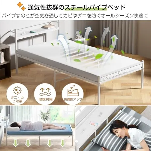 優れた通気性と衛生管理:湿気・カビ対策に効果的 床下の空間と12本のパイプワイヤーにより、通気性が非常に高いと評価されています。「布団からベッドに変えて湿気がなくなった」「夏場の蒸れが軽減された」など、従来の床置き布団や木製ベッドとの違いを実感する声が多数寄せられています。