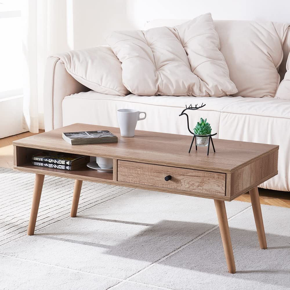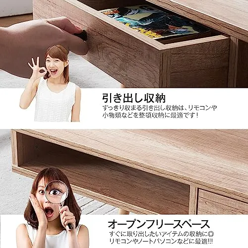 【多様な収納スペース】すっきり収まる引き出し収納は、リモコンや小物類などを整頓収納に最適です。そばのオーペンスペースはマガジンなどの持ち運びに便利なものを入れることにふさわしいです。