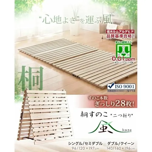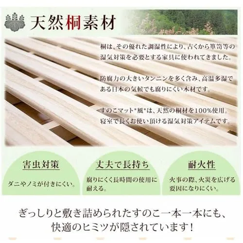 【商品説明】夏場のじめじめ、冬の結露。一年中心配なお布団の湿気対策に、通気性抜群の桐すのこ*風*が登場!平らな桐すのこに更に凹凸をつけたリブ加工で通気性がUP!すのこ枚数も28枚と多くし、寝心地にもこだわりました。二つ折りタイプなので、室内でお布団を干すこともできます。