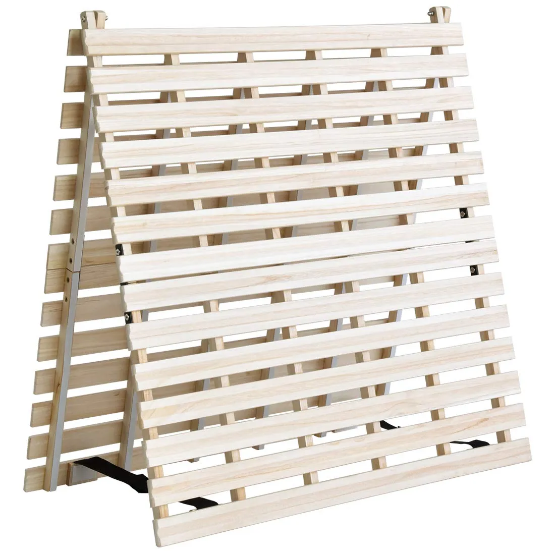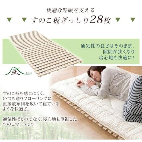 【特徴】通気性抜群のリブ加工 /・すのこギッシリ28枚!ごつごつ感を軽減 /・耐久性のあるすのこ厚1.3cm /・二つ折りにして布団干しも楽に! /・折りたたみ固定は簡単マジックテープ式 /・滑り止め付き