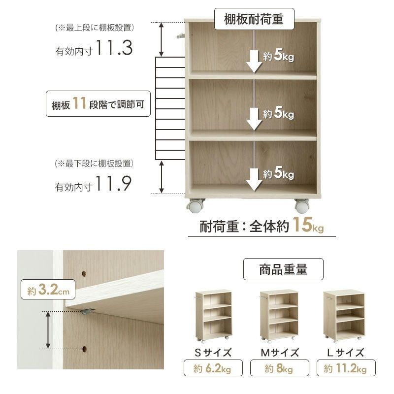 耐荷重:棚板(1枚あたり)約5kg、全体で約15kg