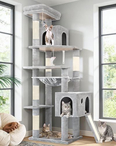大型ハンモック:このキャットタワーには大型ハンモック(43cm x 36cm)が付属しており、使用可能面積が25%増加します。頑丈なハンモックはキャットタワーの太い幹の四隅に固定されているため、体重5kgを超える大型猫でも快適に使用できます。