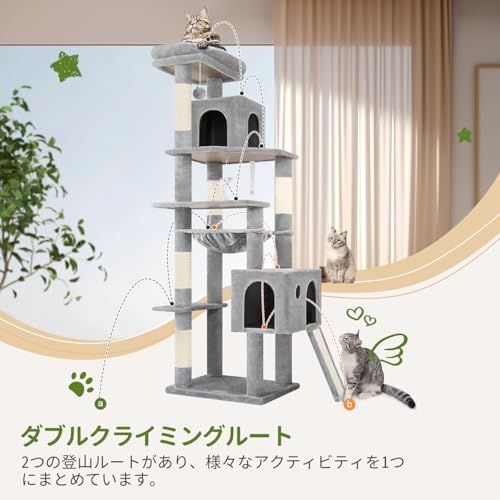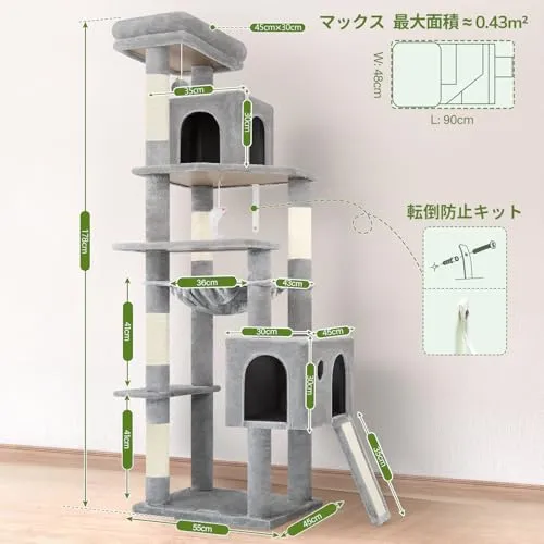 安定したコーナーきゃつとタワー:高さ178cmの頑丈なキャットタワーには、便利なプラットフォームが付いています。大型の猫やシニアの猫でも、キャットタワーなら楽に登ったり降りたりできます。さらに、転倒防止装置を使ってキャットタワーを壁に固定すれば、さらに安定感を高めることができます。