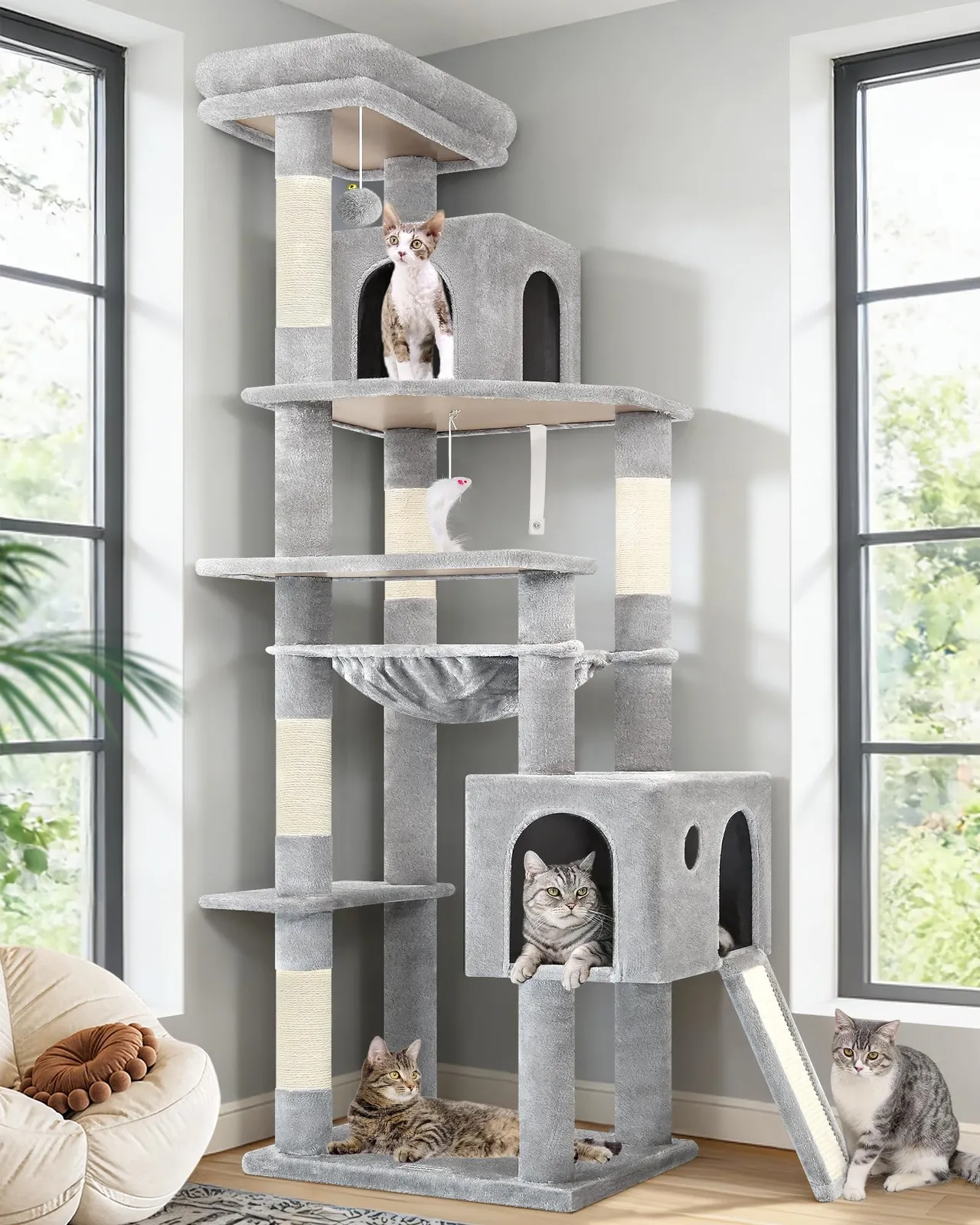 キャットタワー大型猫24匹用:この大型猫タワーには、大型キャットハウス2つ、大型ハンモック、そしてパッド入りのクッション付きの展望台付属しています。24匹の成猫が遊んだり休んだりするのに十分な広さです。