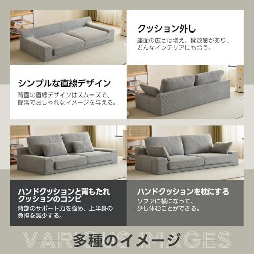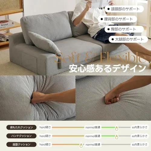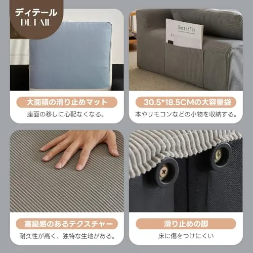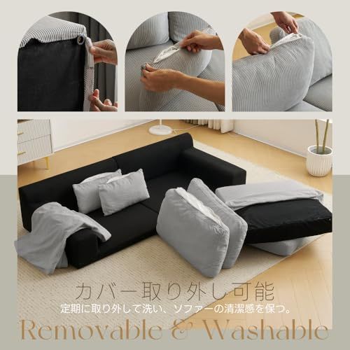 【洗えるカバーでいつでも清潔】 カバーとクッションは取り外し可能で、自宅で洗濯できるのが嬉しいポイント。日常的に清潔を保てるので、小さなお子様やペットがいる家庭にも安心して使えるソファーです。