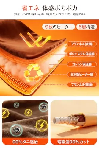 【速暖と安全性を両立・ふわふわ柔らかい肌触り】日本製繊維ヒーターを採用し、熱伝導率が高く、より高速かつ安定に発熱する暖房毛布です。電源を入れてすぐ温まり始め、暖かさが効率よく広がります。5層構造の高密度保温設計により、熱を逃さず、温かい空気をしっかり閉じ込め、まるで着るこたつのようにポカポカが持続します。両面フランネル素材で、柔らかくさわり心地がよくて、折りたたんでもシワになりにくい。電源を使わず、通常のひざ掛けや肩掛けとして普通に使っていても暖かい。防寒対策として、冬の寒さを乗り切るおともにぴったりです。