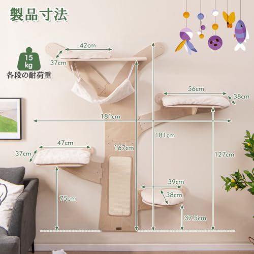 GYMAX キャットウォーク キャットタワー 壁付け キャットツリー 幅181cm×奥行181cm キャットステップ 壁 猫用クライミングシェルフ 木製猫ハウス 猫棚 猫家具 ハンモック サイザル麻 爪とぎポール 着脱式クッション 遊び場 省スペース設計 (/