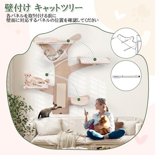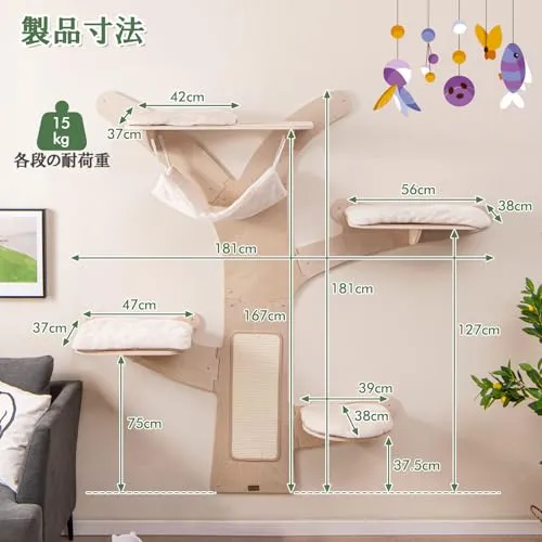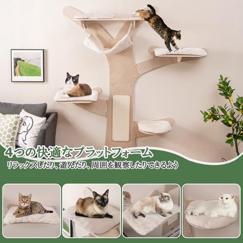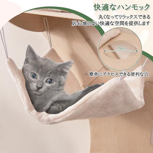 【休憩スペース】ねこちゃんがゆったりと休憩できる快適なハンモックと出入りしやすい猫用の穴が付いています。さらに、4つのクッション付きのプラットフォームが設置されており、ねこちゃんが異なる高さで休息したり、遊びを楽しんだり、周囲を観察するスペースを提供します。