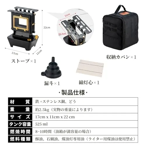【安全性と簡単操作】アイロン ストーブは、ユーザーの安全と利便性を第一に考えた設計が施されています。付属の漏斗により、燃料の補給が簡単かつ安全に行えます。燃料を注ぐ際にこぼれる心配を最小限に抑え、清潔で安心な使用環境を提供します。アイロンストーブは、取り扱い説明書が詳しく記載されており、初めての方でも安心して使用を開始することができます。