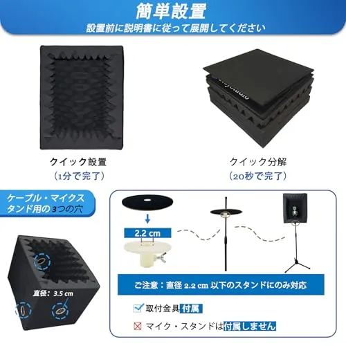 【基本情報】: 設定後の内寸;20 (奥行) X 25 (幅) X 30 (高さ) cm、あらゆるサイズの各種スタジオ機器用に大きなスペース;外寸:30 (奥行) X 30 (幅) X 40 (高さ) cm; 折りたたみサイズ;30 (奥行) X 30 (幅) X 15 (高さ) cm;重さ:0.9kg;フォームは垂れません。ケーブル/マイクスタンド用の穴あり
