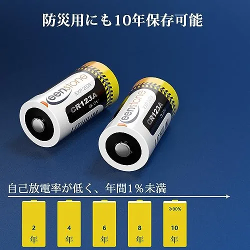 【強力?大容量】keenstone CR123Aリチウム電池は、1600mAhの大容量を備えた最高品質の電池とスマートカーネルを採用し、強力で安定した電力を提供します。通常のアルカリ電池の3~5倍の長寿命;約10年間の貯蔵寿命。大電流放電に対応し、電圧が安定しても停電の心配がありません。自動放電率:1%。ご注意:Arloカメラには適用できません;警告:充電できない!