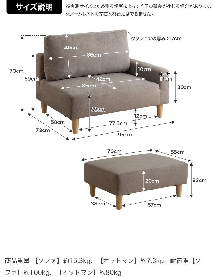 【商品重量】ソファ:約15.3kg、オットマン:約7.3kg