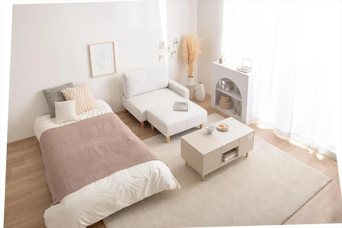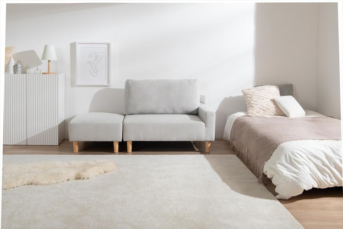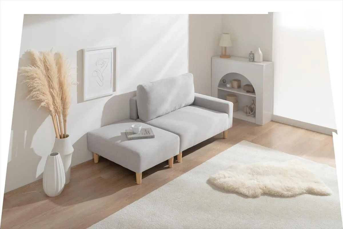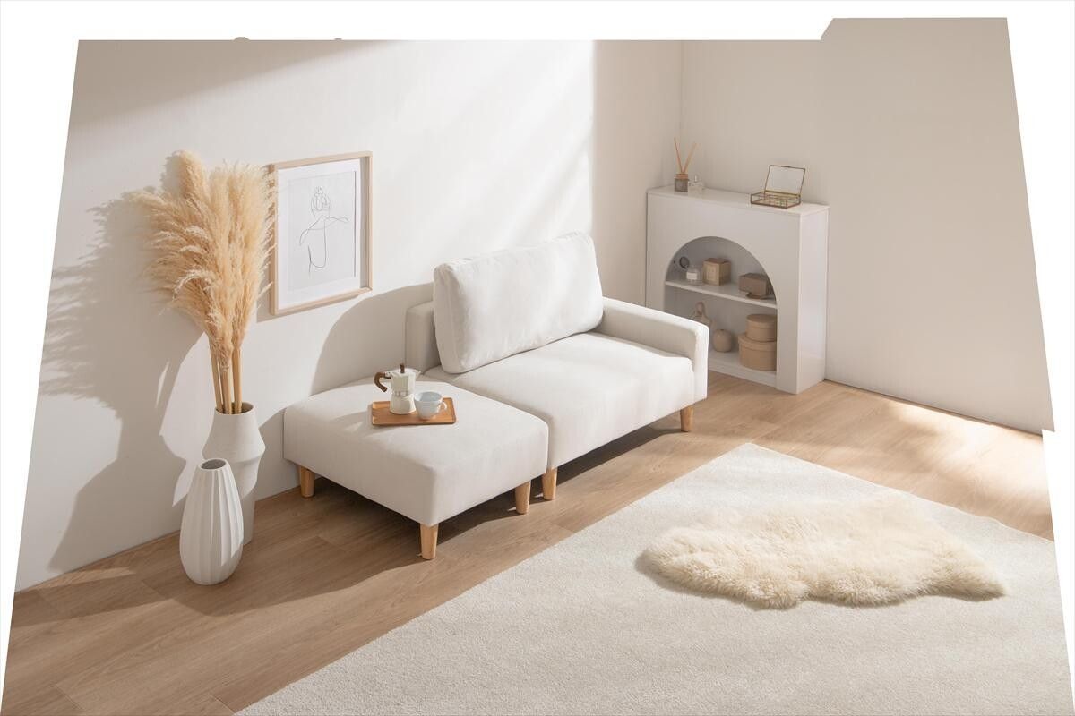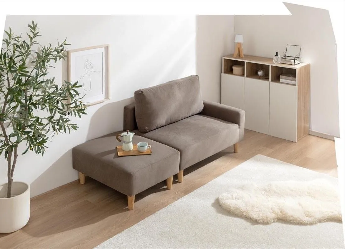 【張地】ポリエステル、天然木 すっきりと空間に馴染むコンパクトなカウチソファ。 一人暮らしやスペースが限られたお部屋にも取り入れやすく、初めてのソファーとしても選びやすいサイズ感に。 コンパクトながらも、ゆったりと腰掛けられる設計で、毎日のリラックスタイムをゆったりお過ごしいただけます。 さらにオットマンを組み替えれば、シーンに合わせたレイアウトが可能。自分だけのくつろぎの空間をお作りいただけます。