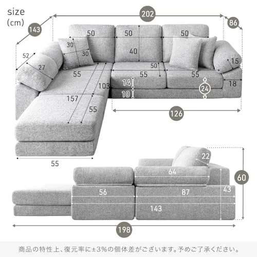 【サイズ】幅202奥行198高さ60cm(カウチスタイル時) / 座面高:24cm