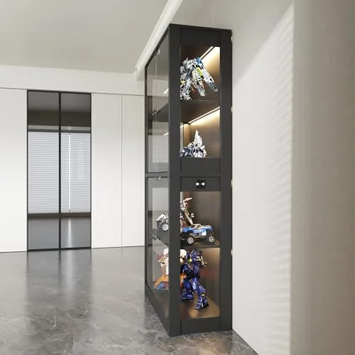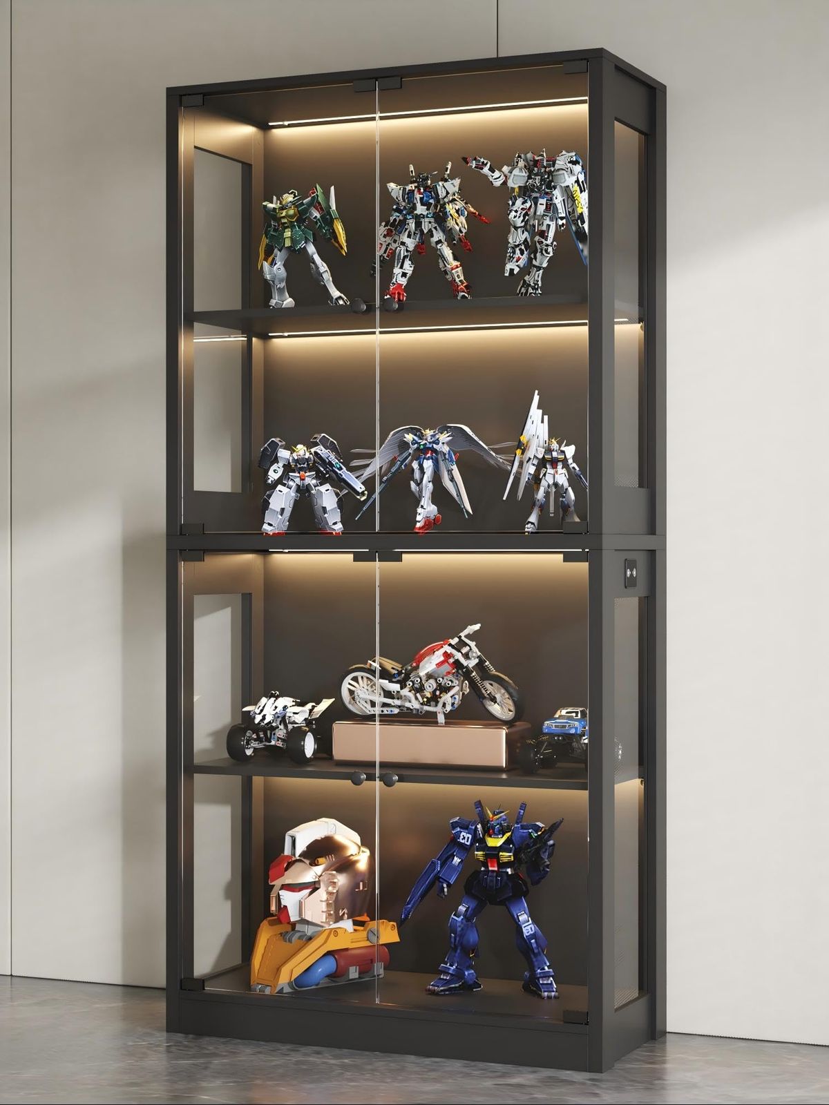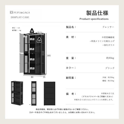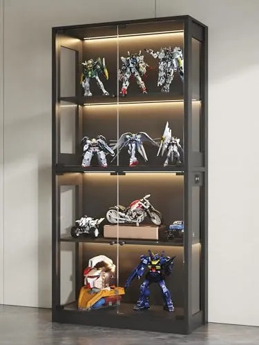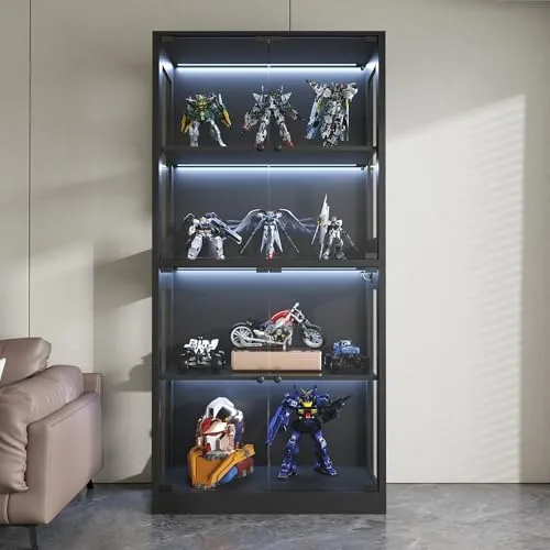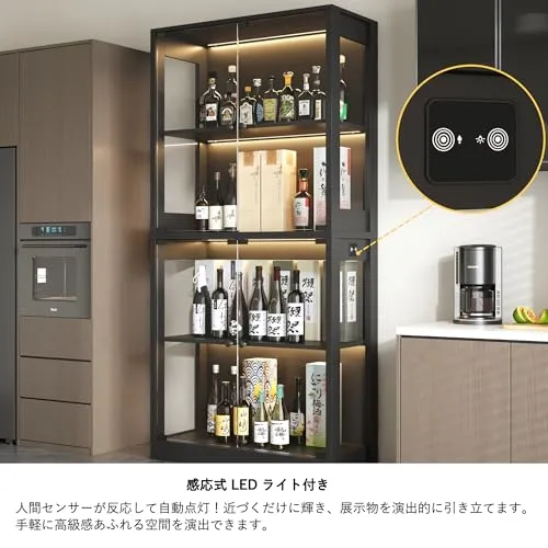 FUFU&GAGA ガラスケース 4段両扉タイプ センサーライト 木製 コレクションシェルフ 幅80 ディスプレイラック おしゃれ リビング収納 ブラック/