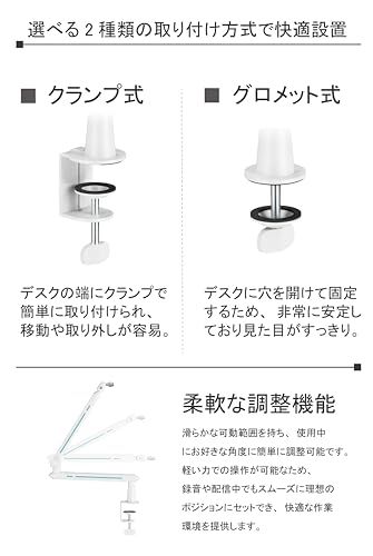 簡単な取り付け::クランプ式でデスクにしっかりと固定できるため、設置や取り外しが簡単で、場所も取りません。これにより、安定性を保ちながらマイクを使用できます。