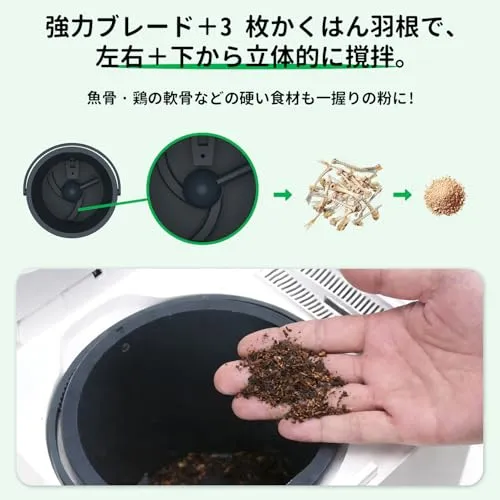 【強力粉砕&乾燥で生ゴミを大幅減量】 強力な粉砕と乾燥により、生ゴミの体積を最大 90%削減可能。魚の小骨・鶏の小骨なども問題なく処理できます。※大きな骨・貝殻など硬すぎる食材と油などは処理できません。