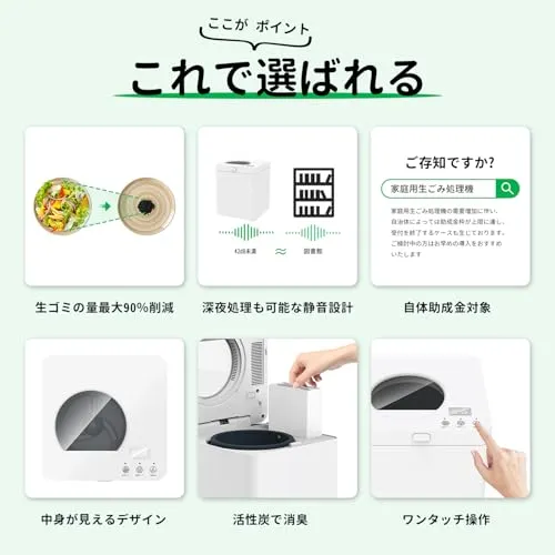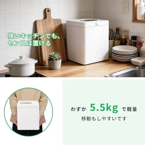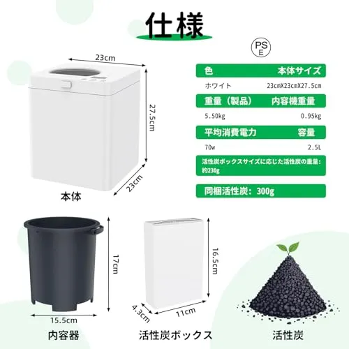 【容量・対象世帯】コンパクト設計でキッチンに置きやすく、12 人暮らしなら 1 日分、34 人暮らしなら 1 食分の生ゴミ処理に適しています。一度に処理可能な量は約 2.5L で、少量の生ゴミをこまめに処理するのに最適です。