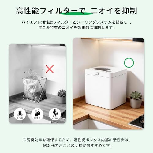 【臭い対策&密封構造】活性炭フィルターとシリコンパッキンの二重構造で臭いを抑制。※生ゴミの種類や量、お手入れ状況によっては臭いが気になる場合があります。