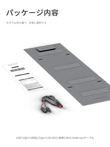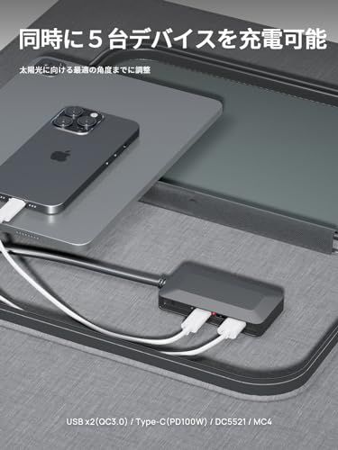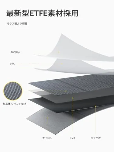 「高交換効率・MC4ポートで急速充電」アメリカ製の高品質パネルセルを利用し、最大23%発電交換効率を実現します。またMC4口を内蔵し、従来のDC(最大10A)より最大20Aで電源切れに心配なし。 *注意事項:太陽光の強度、設置する方向などにより、発電量は大きく変わる可能性があります。またポータブル電源の入力電圧仕様問題にもご注意ください