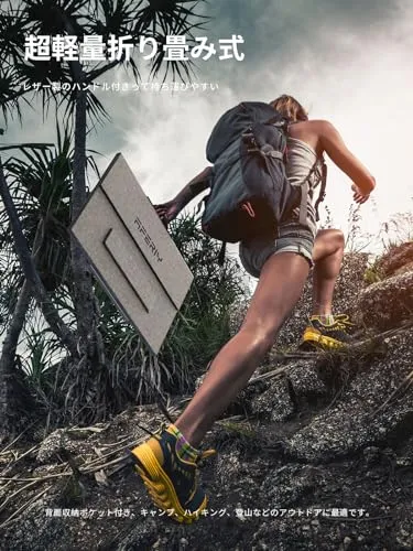 「軽量でコンパクト・防水防塵」折りたたみ式、小型軽量で持ち運びが便利です。キャンプ、ハイキング、登山などのアウトドアに最適です。本製品はIP65防水防塵の素材を利用し、耐久性を保証します。またFCC, RoHS, CEなど認証を取得し、過充電保護、短絡保護、過電流保護などの保護機能が搭載され、安全性を確保します。