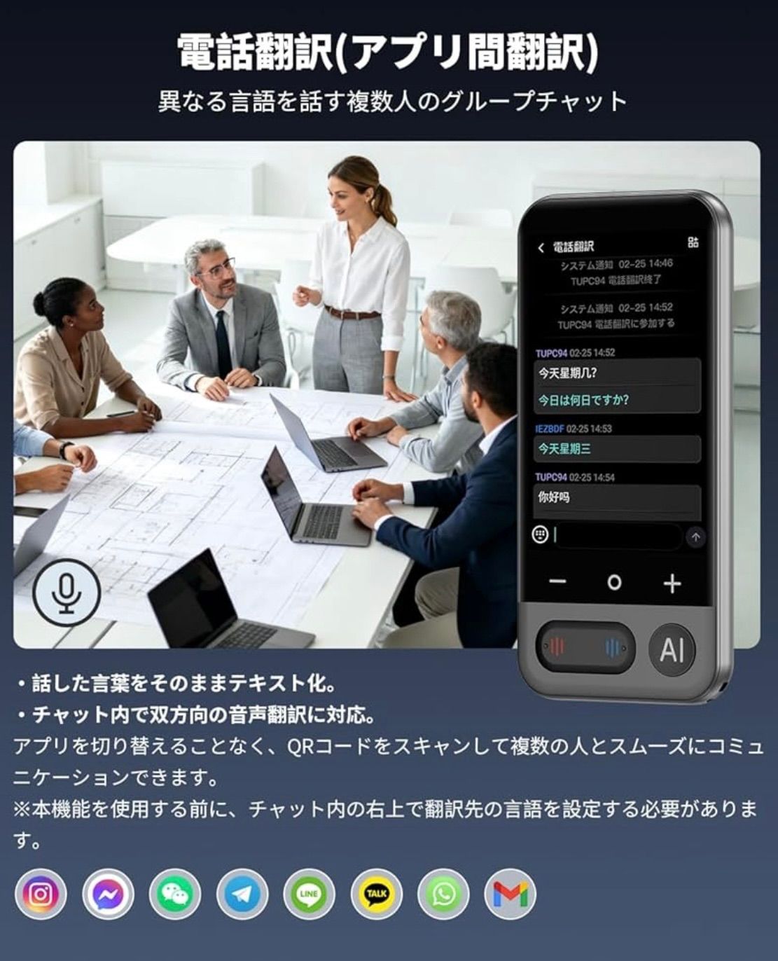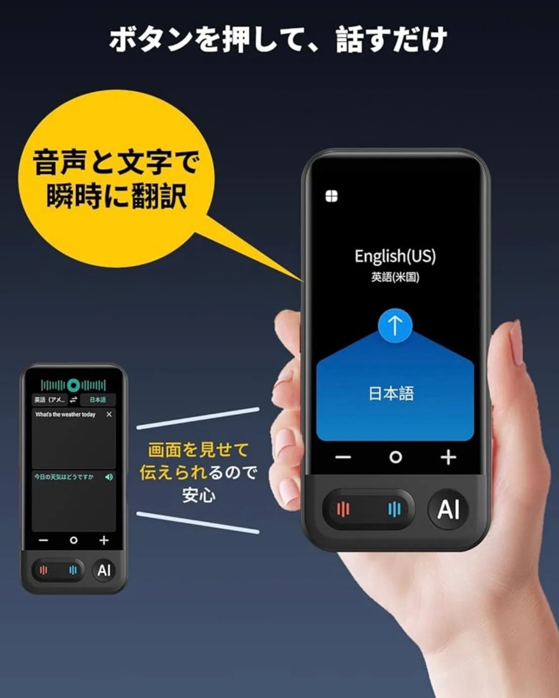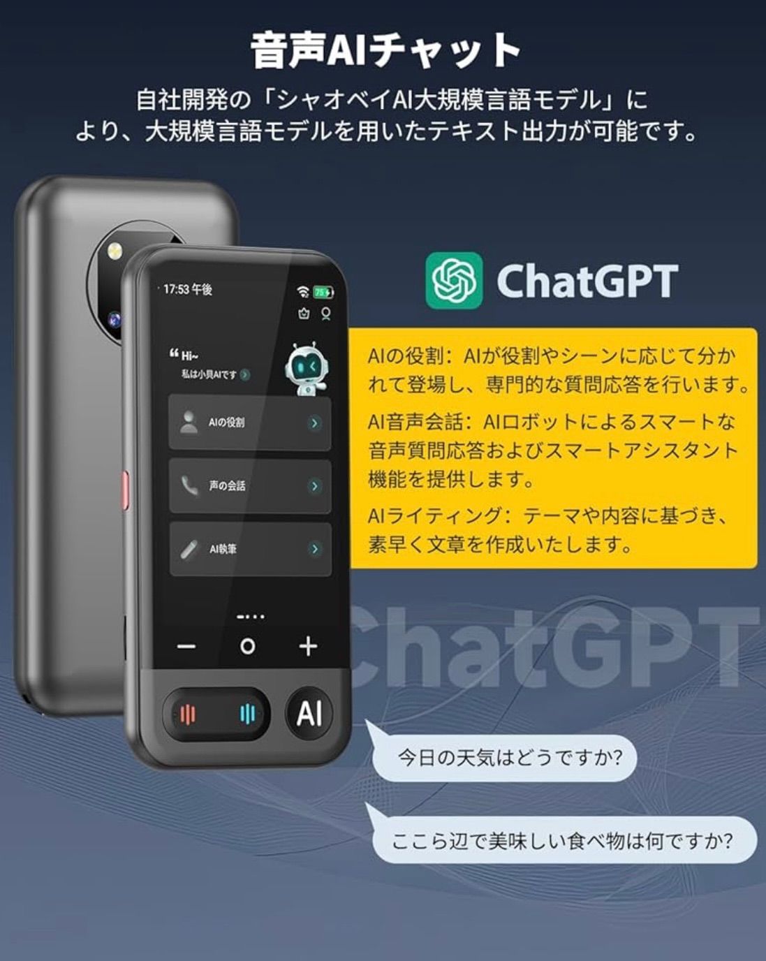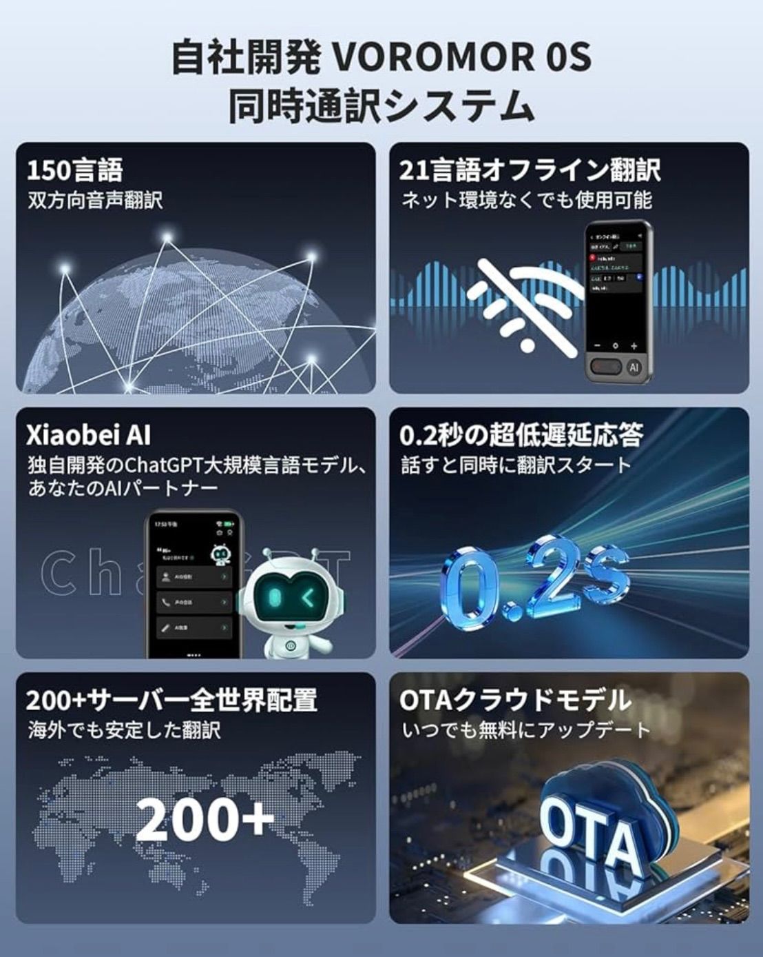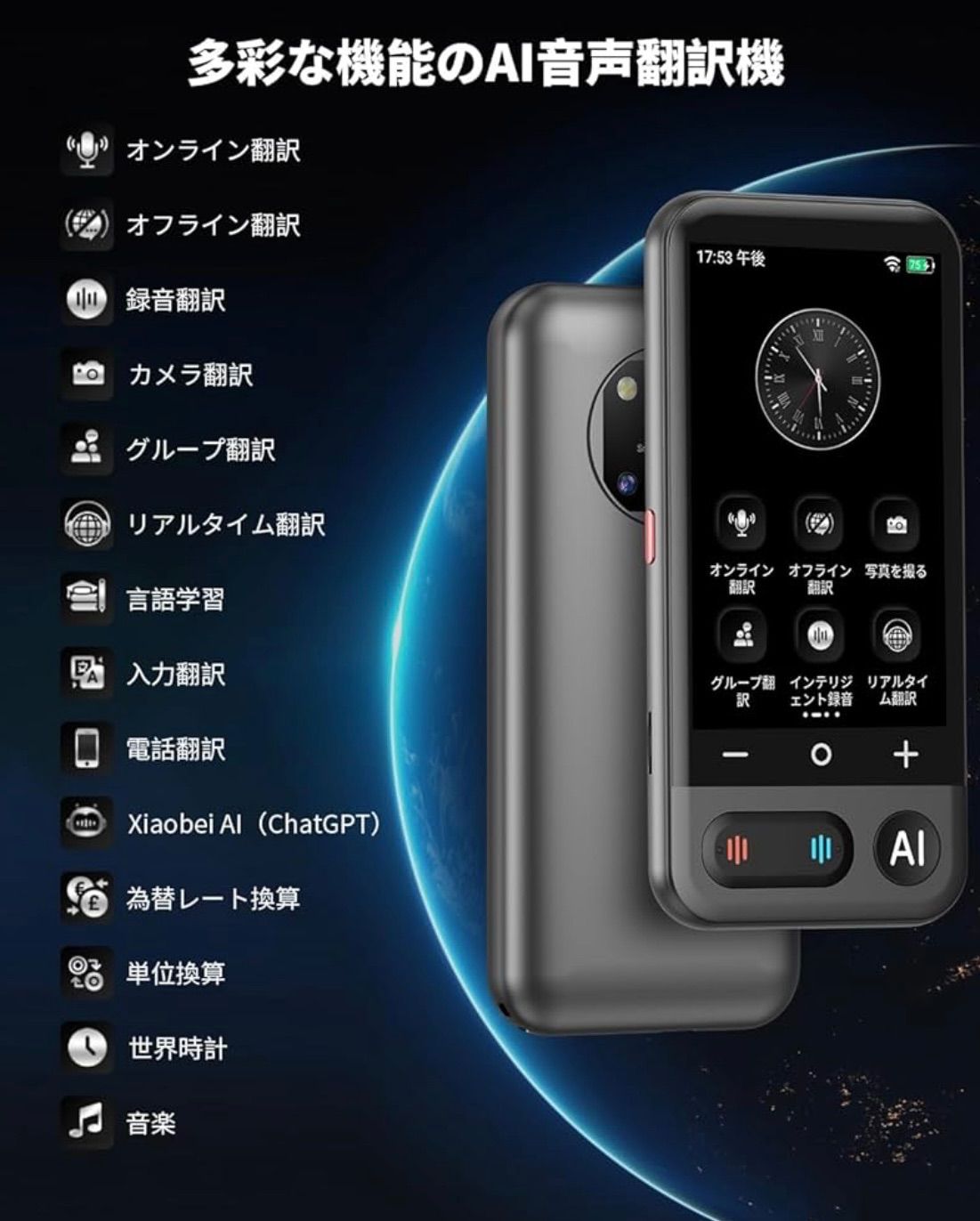 【日本語⇄英語・中国語・韓国語・タイ語・スペイン語】などの21言語を含めています。ご注意:オフライン翻訳の機能を使用する前に、オフライン言語をダウンロードする必要があります。 主な搭載機能:オンライン翻訳、オフライン翻訳、カメラ翻訳、録音翻訳、リアルタイム翻訳、グループ翻訳、電話翻訳、入力翻訳、ChatGPT、言語学習、翻訳結果自動保存など。ご使用上の注意: 初回使用時には2時間の充電が必要です。また、5GHz WiFiには対応していないため、2.4GHz WiFiをご利用ください。 MUMEOMU Z16は、翻訳機能だけでなく、AIを活用した多彩な機能で、あなたのコミュニケーションや情報処理をサポートします。xiaobeiAI音声アシスタントサーバーがChatGPTと連携しています。 xiaobeiAI大規模言語モデル:テキストエクスポート、スマート抜粋、スマート音声アシスタント、スマート編集(AI編集、AI校閲、AI拡充、AI続編作成、AI文章要約)。1日3回無料で利用することができます。AI機能は毎日最初の3回は無料で、4回目からは有料が必要です。 世界時計があり、いつでも現地の時刻を確認できます。世界の為替レートをリアルタイムで更新するため、海外での消費情報が一目瞭然。また、音声をテキストに変換したり、個人メモを自動作成できます。4.1インチの大型ディスプレイに高解像度540x1080P採用で、画面の文字が断然見やすくなりました。118g超軽量ボディで、携帯便利。 569 $$8999