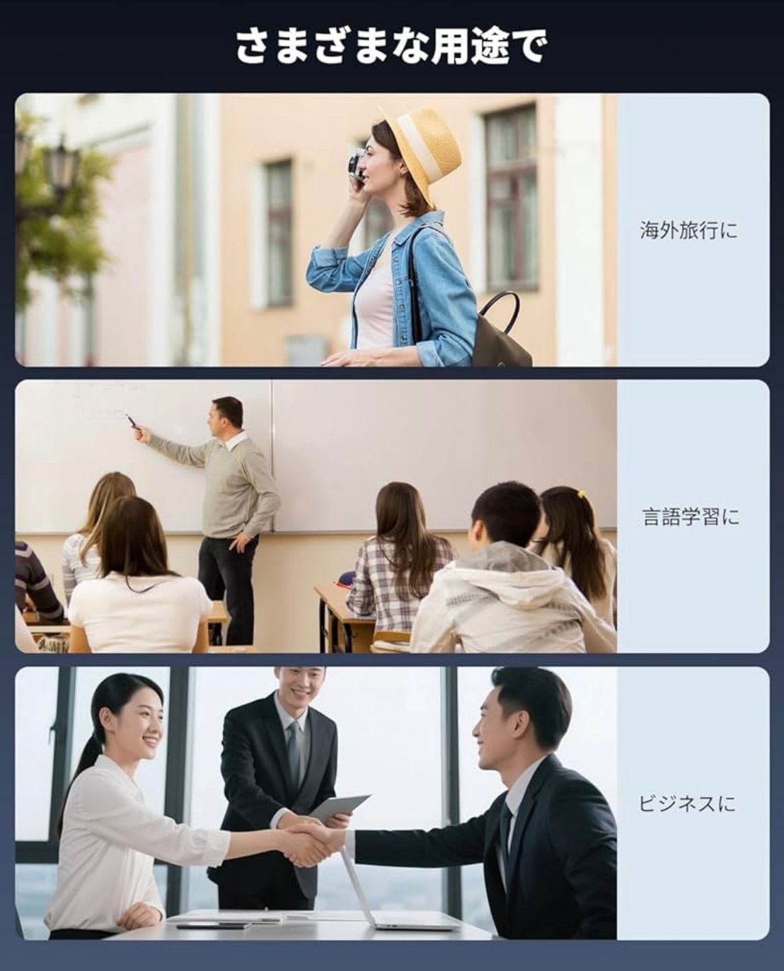 【2000円お値引き】 《ご利用の流れ》 ①気になる商品を探す。 ②購入金額の下に表示されているクーポンをタップする。 ③割引が適用されたことを確認して、そのままご購入ください。 ※システム上、ご購入手続き完了後にお値引き(クーポンの適用)をすることはできません。必ず「ご購入時」にクーポンを選択・適用してください。 新発売MUMEOMU Z16音声翻訳機はエッジAIモデル搭載で、翻訳スピードは従来比30%向上!先進的な AI LLM モデルによってコミュニケーションの文脈を理解し、聞き間違えやすい同音語を自動的に修正します。これにより、98%精度リアルタイム翻訳を実現。また、高精度な雑音除去技術を搭載、雑音の多い環境下でも正確に音声を認識可能です。 MUMEOMU Z16は、150カ国の言語に対応したオンライン翻訳機能を備えています。わずか0.2秒で迅速かつ正確に翻訳を行うことができ、言葉の壁を感じることなくスムーズなコミュニケーションを実現します。話すだけで希望の言語に即座に翻訳し、音声で再生することが可能です。海外旅行では現地の人々との交流をより深め、外国語学習では効率的な学びをサポートします。また、ビジネスシーンにおいても異なる言語間のコミュニケーションを円滑にし、国際的なビジネスの場での信頼関係構築に貢献します。 SIMカード不要!ネットワーク接続無しで、21言語のオフライン翻訳をサポートします。オフライン翻訳は