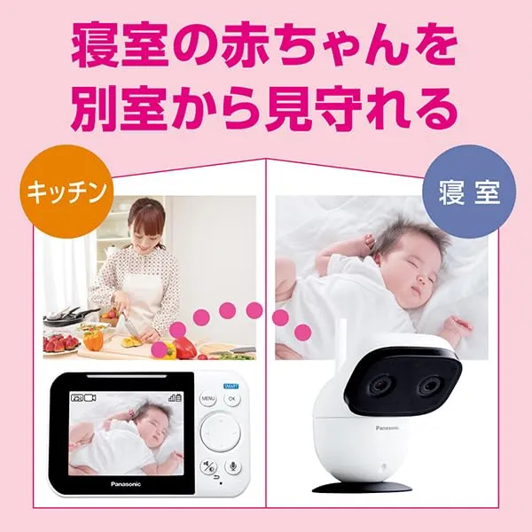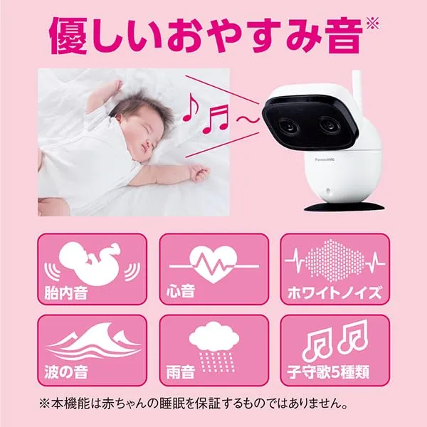 モニター機の光と音で赤ちゃんの様子をお知らせします。 使用可能距離:約100 m(見通し距離) 撮像素子:CMOS 30万画素 モニター機使用時間(ワイヤレス時):約5時間(周囲温度20 、満充電の状態から連続モニターした場合)※ACアダプターでも使用可能 モニター機充電時間:約8時間(周囲温度20 、待機状態で充電を行った場合)