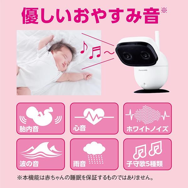胎内音、心音、ホワイトノイズ、波の音、雨音の5種類のおやすみ音と子守歌を搭載しました。モニター機から手動で再生・停止できるほか、設定により音声を検知したときに自動再生することもできます。たとえば寝室で眠っていた赤ちゃんが起きて泣きだした時に、自動でおやすみ音をカメラから流すことができます。