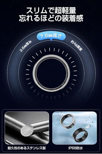 【睡眠管理と24h健康管理】 スマートリングの光学式センサー、重量センサー、赤色センサーによって、健康管理が可能です。夜間リングを付けたまま寝ると、翌日アプリより睡眠時浅睡眠、深睡眠、REM睡眠の時間帯、目覚めた回数などの睡眠の詳細が確認できます。睡眠の質評価とアドバイスも表示されます。また、他のデータも5分間ごとに精密で持続的に測定し、一日中のデータの詳細も確認でき、あなたのフィットネス目標の達成をしっかりサポートします。