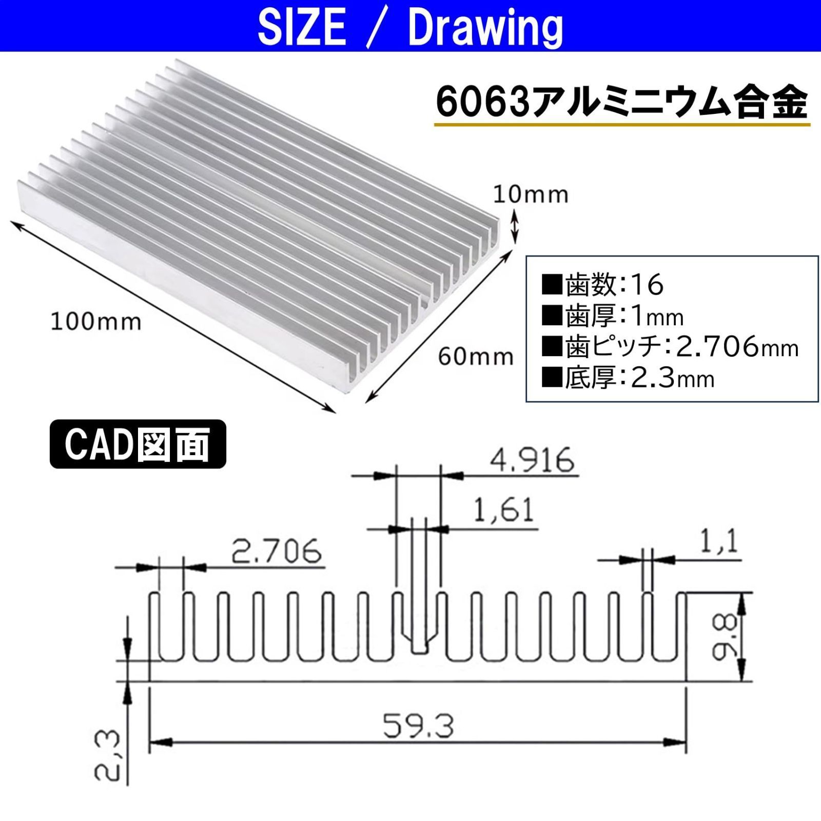 ヒートシンクの材質は、高温耐性、放熱性、耐食性、耐久性に優れた6063アルミニウム合金製です。サイズ100×60×10mm、歯数16、歯の厚み1mm、歯のピッチ2.706mm、底厚2.3mm。