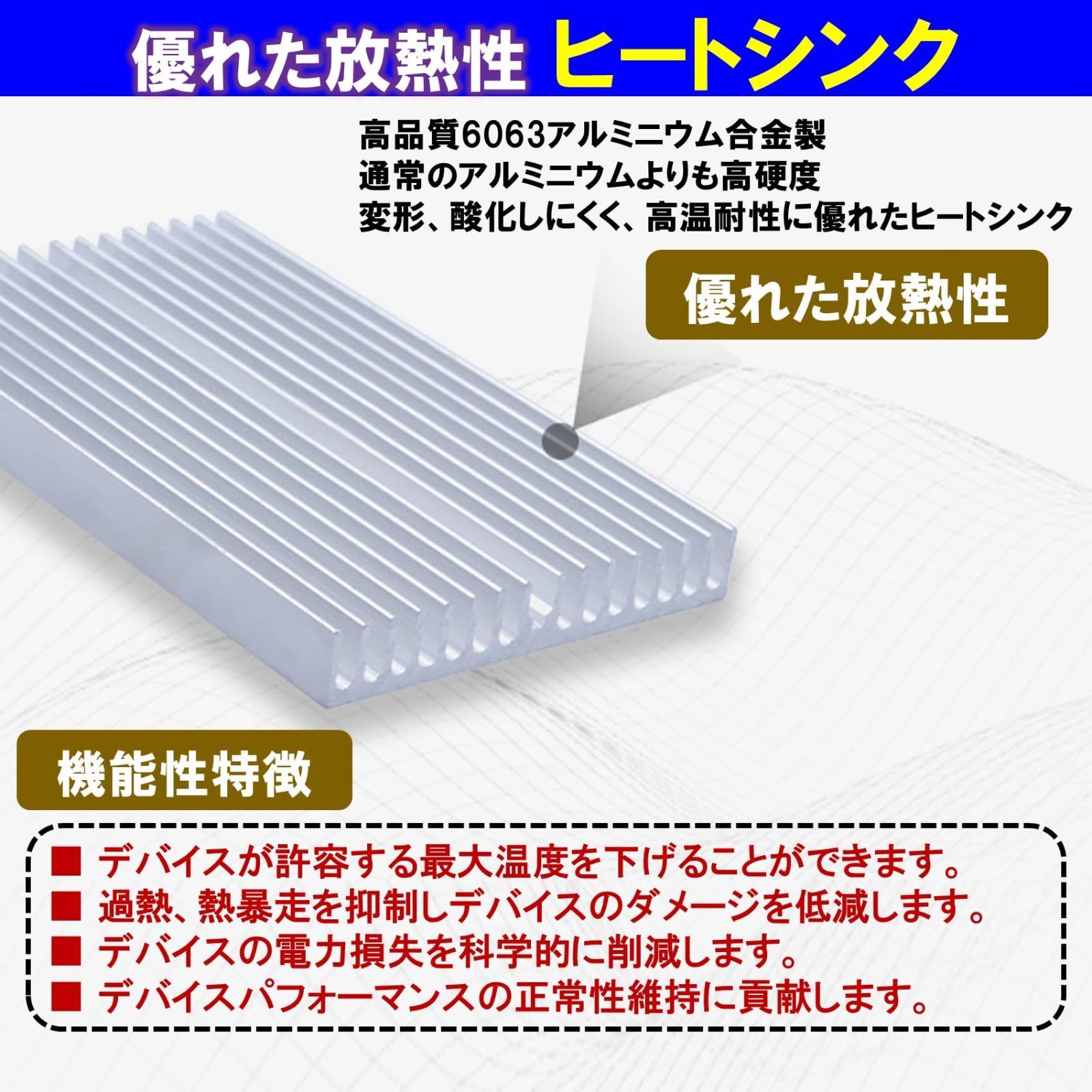 6063アルミニウム合金は通常のアルミニウムより高硬度で、変形、酸化しにくく、高温耐性、放熱性に優れた素材です。ヒートシンクは、デバイスの過熱、熱暴走を抑制し、パフォーマンスの安定化を図ります。