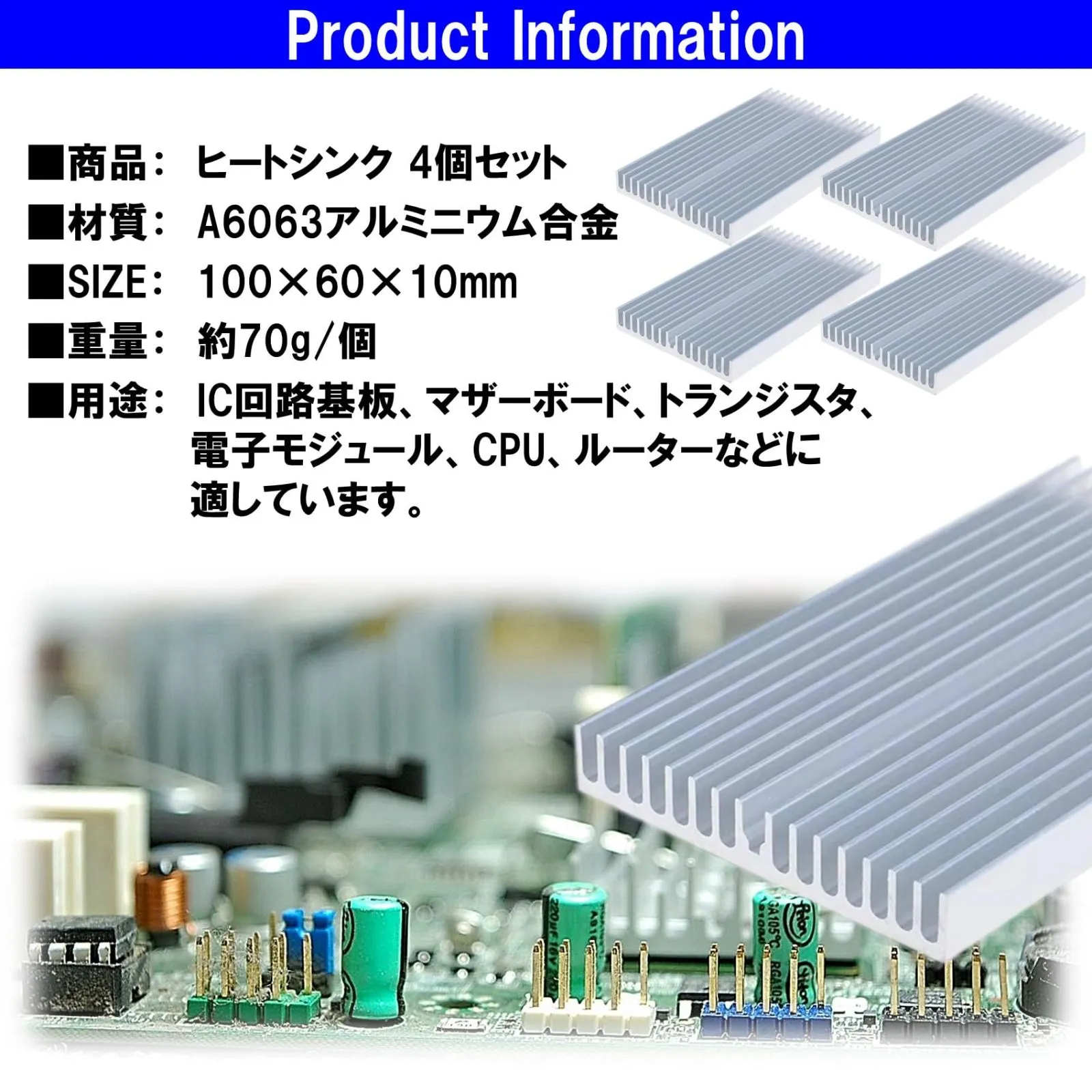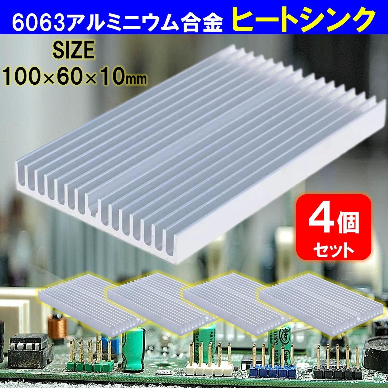 6063アルミニウム合金製放熱板ヒートシンク4個セット。100×60×10mm大型サイズ。ヒートシンクは、電子機器デバイスの熱を空気中に放出し、パフォーマンスの正常性を維持し、機器類を安定的に動作させるために役立ちます。