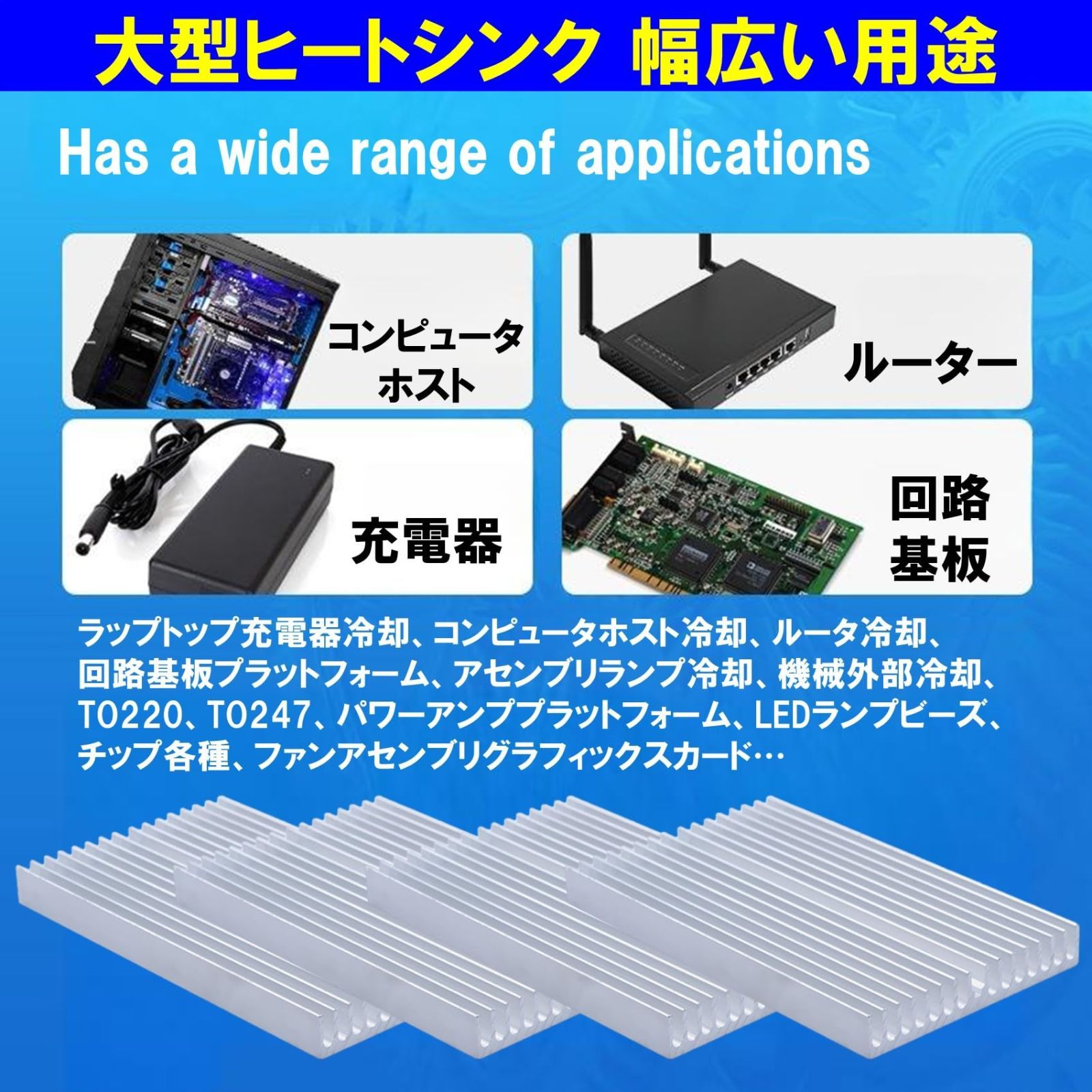 ヒートシンクは、多様な用途で、コンピュータホスト、ルーター、充電器、回路基板など様々な電子機器、電子部品の放熱に役立ちます。4個セットですので、複数の機器でご使用いただけます。