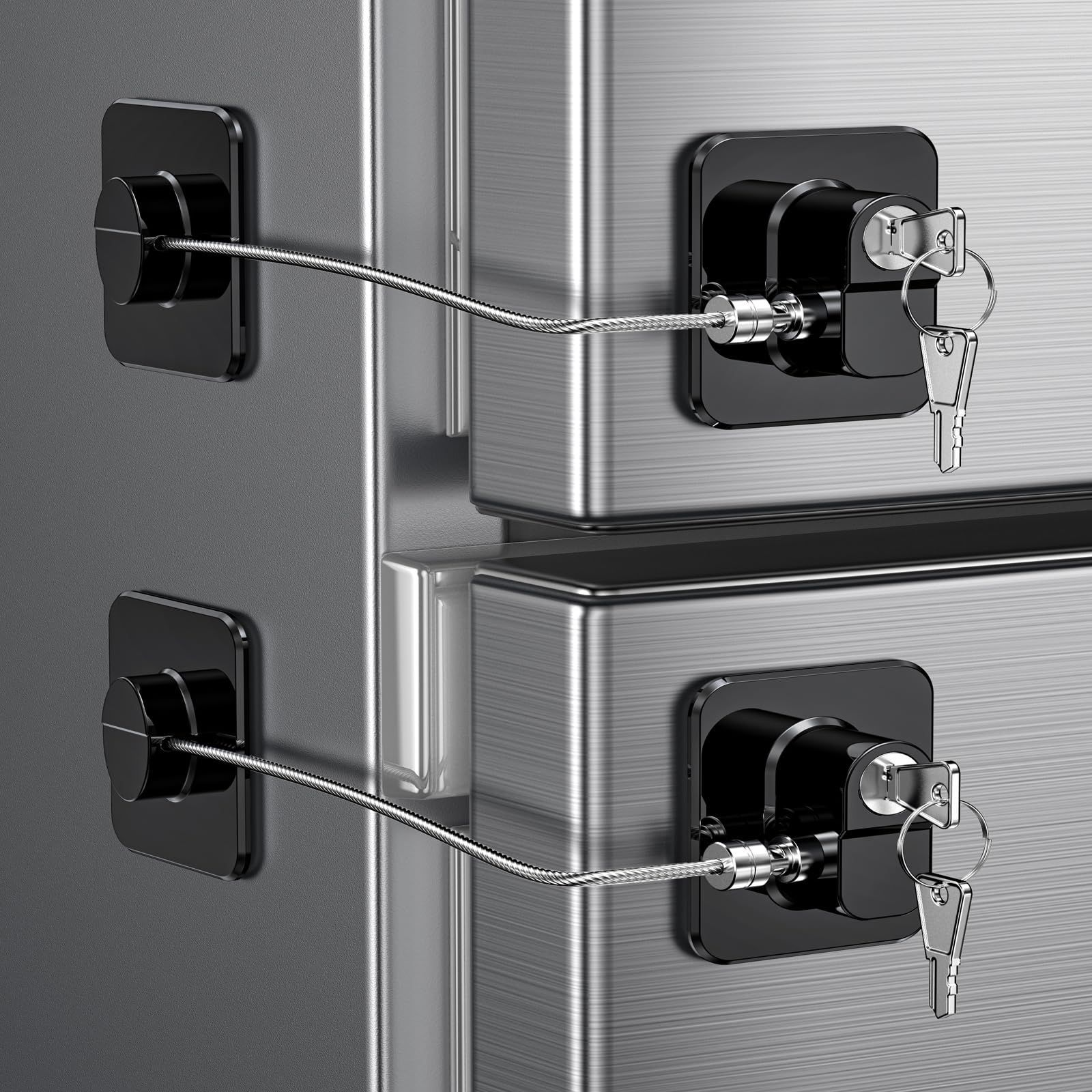 2個冷蔵庫ロック 鍵付き パック 子供 幼児 大人用 粘着性 子供&赤ちゃん プルーフ 冷蔵庫ラッチ ダブルドア フレンチドア キャビネット 引き出し オーブン 窓用 (特許) (ブラックロック2個)