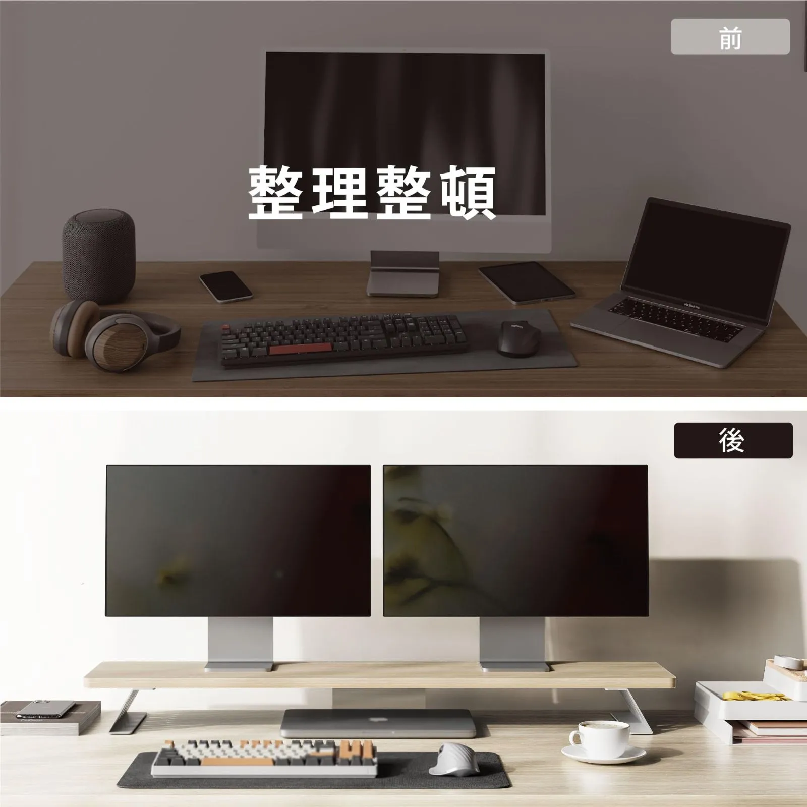 【卓上をきれいに整えるモニター台】パソコン台の内寸は90cm*23cmなのでキーボートやマウスなどデスク周りの物をすっきりに整理することで、机の上のスペースが広くなり、オフィスやテレワーク作業効率をUPします。