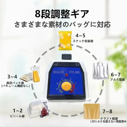 【8調整可能なギア】温度は自由にあなたの好みに合わせて、推奨レベル、ビニール袋:1~3レベル、クラフト紙袋:4~5レベル、アルミ箔袋:6~8レベル、高温シーリング、簡単でトラブルフリー。袋によってシール時間が異なりますので、袋の実際の状況に応じて調整してください。温度が高すぎると袋が溶けてしまい、温度が低すぎるとシールできなくなります。 (必ず専用の密封袋を使用して密封してください)