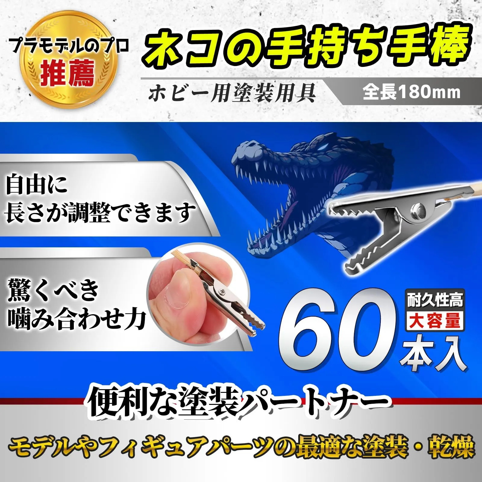 パッケージ内容: 塗装 持ち手 全長:180mmで、塗装 クリップ金属部36mmのサイズです、重量:塗装棒 2g。パッケージには60個入りが含まれています。このサイズは、細かなパーツの塗装・乾燥に最適です。60本入りで販売されています。この大量の量は、同時に多くのパーツの塗装作業を行う際や使い捨て感覚での使用に最適で