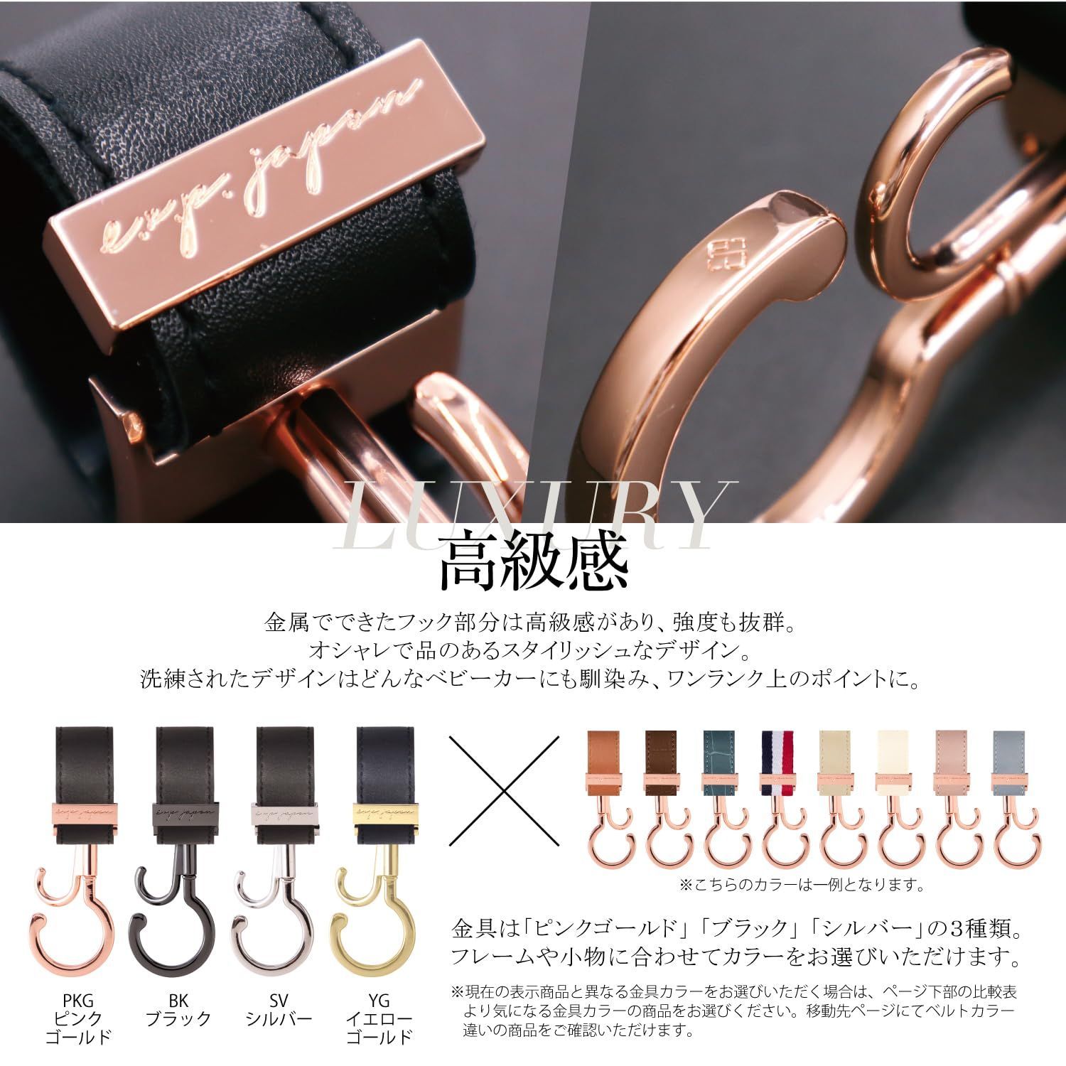 LUXURIOUS BUGGY HOOKS 「ママが使いやすい!」を形にした回転式ダブルフック。 360度回転するのでどの向きからも荷物が掛けられ、ちょっとした買い物袋も掛けられるダブルフック仕様のベビーカーフック。 金属でできたフック部分は高級感があり強度も抜群! 旅行のキャリーケースや自転車、車のヘッドレスト等につけて収納アイテムとしても活躍してくれます。 ベビーカーを選ばないので、どのハンドルにも簡単に取り付けられます。(特殊な形状の物など一部不可) テストを重ねた亜鉛合金の強度で丈夫な仕上がりになっており耐荷重は60㎏。 ※ベビーカーの転倒の恐れがありますので、荷物のかけすぎには十分にご注意ください。