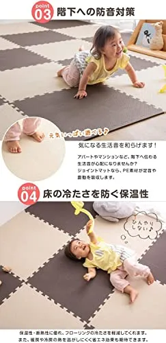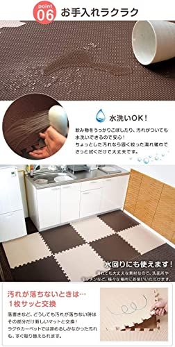 【お手入れ方法】・汚れた場合は固く絞った雑巾で拭き取るか、水洗いをしてください。・水分が隙間に入り込んだ場合はカビ発生の原因となる場合がありますので、定期的にマットを剥がして掃除してください。・匂いが気になる場合は、風通しの良いところで陰干してください。 ・表面の凹凸の深さに若干の個体差がある場合がございます。 ・ロットによって色味が異なる場合がございます。 ・床暖房の種類等によって、商品に多少の反りが生じる場合がございます。 ・PE素材の特性上、使用するうちに負荷がかかる部分に多少のへたりが生じます。 そのため、既に使用しているマットに新しいマットを繋げて使用する際、上手く繋がらない場合もございますので、予めご了承ください。 2019年1月10日に素材をEVAからPEに変更しました ※床材(塩化ビニル・フローリング等)によって、色移りや変色が起こる場合がございます。床とマットの間に敷物や防護シートを敷いていただくことを推奨しております。