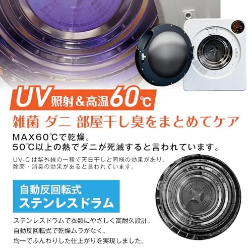 【UV-C照射で衣類ケア】MAX高温60で乾燥。50以上の熱でダニが死滅すると言われています。 UV照射機能を搭載。UV-Cとは、紫外線の一種で天日干しと同様の効果があり、除菌・消臭の効果があると言われています。