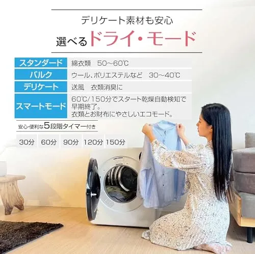 【大容量・高級感】最大容量6kgで一度に6人分の乾燥が可能、1人暮らしの方から56人のご家族向けに幅広くご活用頂けます。お部屋のインテリアとしても高級感のあるデザインです。AIスマートモード(乾燥自動検知終了モード)があります。
