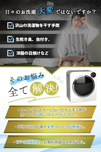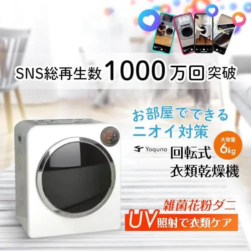【Yoquna 衣類乾燥機 6kg Proモデル】開始予約、しわ防止、厚手物モードの3つの機能が追加された上位モデルです。色:ホワイト。高級感のあるLOGO入り。説明書付属。使い方動画あり。