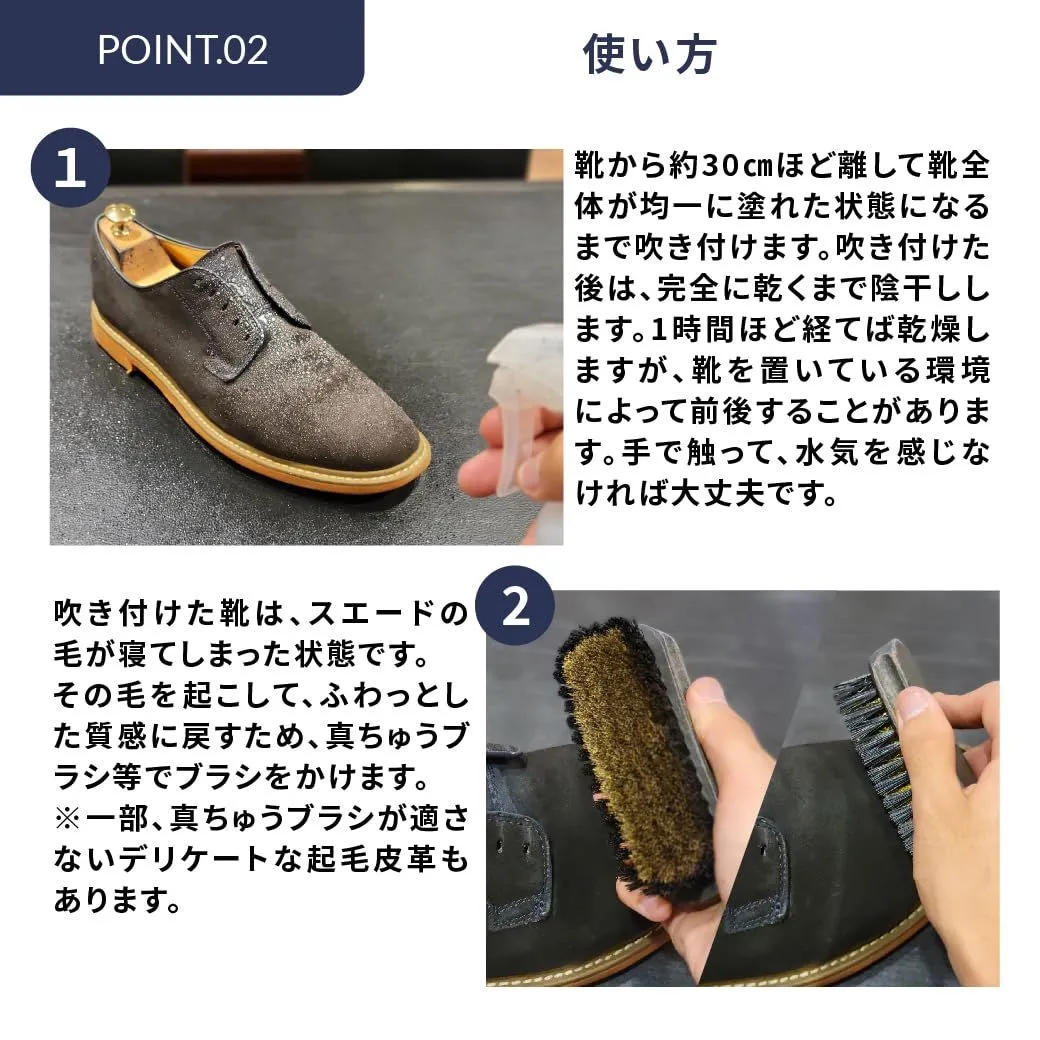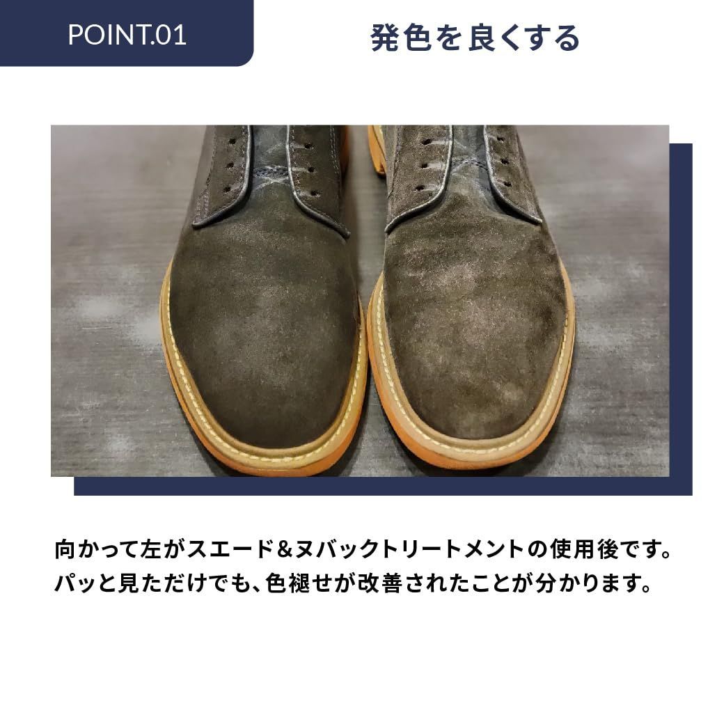 ・乾燥してしまったスエード・ヌバックに十分な潤いと栄養を与えます。・乾燥や経年により退色してしまった革が潤うことで発色が良くなり、もともとの色が蘇ります! ・ミストタイプなので革に浸透しやすく深くまで浸透し乾く過程で革の深部の色を表面に押し上げてくれます。・ブラッシングでホコリを落とし、毛並みを整えた後でご使用下さい。・乾いたら再度ブラッシングをすることで発色の良さを実感できます。・何度か繰り返すことで発色が蘇ります。※この製品自体には防水効果はありませんので、ケアの仕上げに
