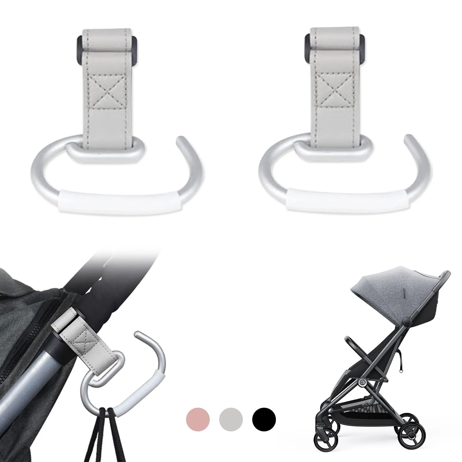 JnTech ベビーカーフック マルチフック バギーフック マジックテープ式 耐荷重15kg 荷物かけ 滑り止め マザーズバッグ ベビーカー フック 荷物フック おしゃれ アルミ合金 合皮 高耐久 使いやすい ベビーカー・自転車・バイクに最適 ブラック グレー ピンク 2個セット (グレー)